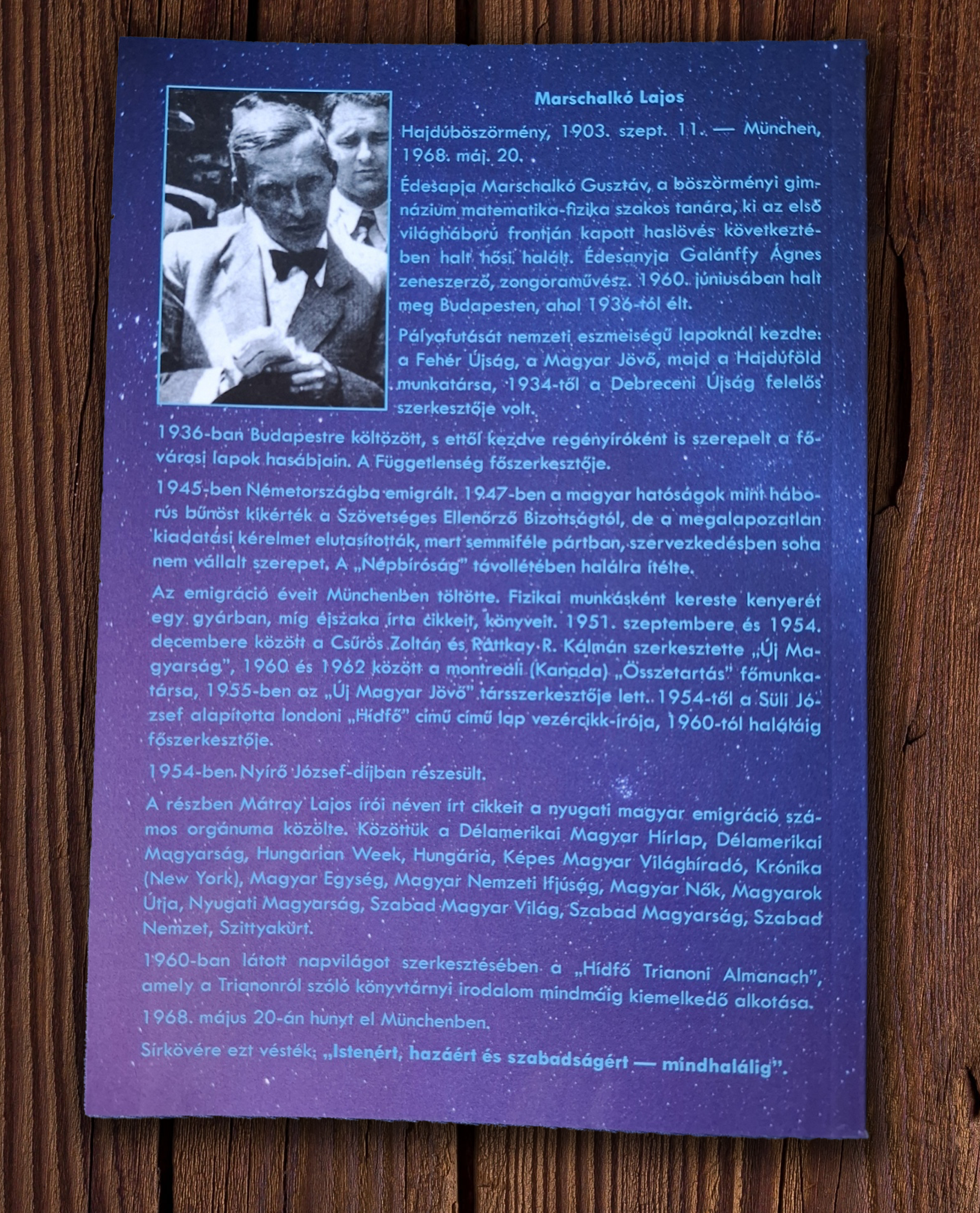 "A Hídfő Könyvtár 1967. novemberi számában jelent meg Marschalkó Lajos Világterror - világuralom című politikai esszéje, melynek témája a Németországban és világ más részein egyre elharapódzó és ipari méreteket öltő embervadászat. A III. Birodalom egykori prominensei már régen halottak, de a bosszú lángja még nem akar kialudni és a "nácivadászok" a nagy halak után a kisebbekre és a még kisebbekre vetették ki hálóikat. Marschalkó e tendenciózus folyamatokat már akkor világterrornak nevezte, pedig mai szemmel nézve ezek még csak bizony árnyékai voltak az ezredforduló utáni törzsi bosszúnak...