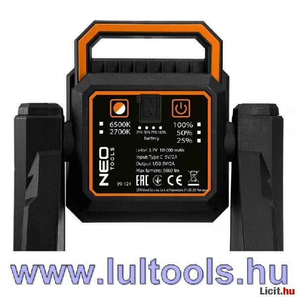 A NEO TOOLS által gyártott 3000 lm 99-124 halogén teleszkópos reflektor egy többcélú világítóeszköz teleszkópos lábakon, amely lehetővé teszi a fény beállítását a 103 cm-ig állítható magasságnak és a fényvetítési szög beállításának köszönhetően. A reflektor nagy teljesítményű COB LED-ekkel van felszerelve, amelyek akár 3000 lm megvilágítást biztosítanak. Működése egy 10 000 mAh-s akkumulátoron alapul. A teljes feltöltési idő 8 óra (USB C kábel tartozék). Feltöltés után akár 21 órán át is működhet (750 LM, 10 óra - 500 LM, 5 óra - 3 000 LM beállítások mellett). Töltés közben is működik, és egy beépített kijelző mutatja az energia felhalmozásának előrehaladását. A NEO TOOLS márkájú lámpa hideg és meleg fényt is lehetővé tesz. A kelvin- és a színjelző segítségével jobban meghatározhatja a szükséges megvilágítás típusát. A powerbank funkciónak köszönhetően lehetőség van telefon vagy más kis eszköz csatlakoztatására a töltéshez. A NEO TOOLS halogén reflektor hasznosnak bizonyul a műhelyben, az építkezésen és sok más helyzetben.